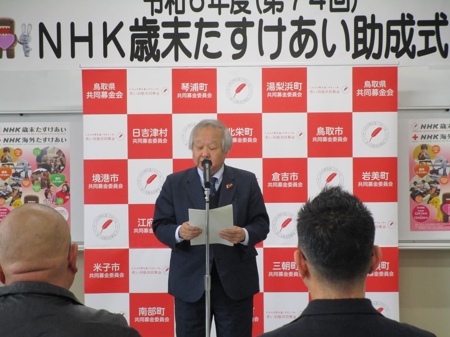 令和6年度(第74回)「NHK歳末たすけあい」助成式を12月26日(木)に開催しました。本年度の「NHK歳末たすけあい」では、5団体が助成を受け、助成式では、NHK鳥取放送局の新見局長様と本会の藤井副会長より助成が決定した各団体の代表者に対し、目録贈呈を行いました。その後、助成を受けられた団体を代表して、特定非営利活動法人 リカバリーポイント鳥取ダルクの千坂施設長様よりお礼の言葉を頂きました。