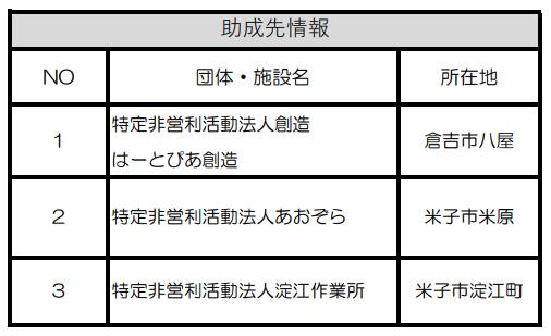 令和7年度(第75回)「NHK歳末たすけあい」助成式は大雪のため中止いたしました。 令和7年度(第75回)「NHK歳末たすけあい」助成式は大雪のため中止いたしました。本年度の「NHK歳末たすけあい」では、3団体が助成を受けました。 ~「NHK歳末たすけあい」では皆様のあたたかいご支援ご協力をありがとうございました~ HOME | 助成を受けるには | 令和7年度(第75回)「NHK歳末たすけあい」助成式